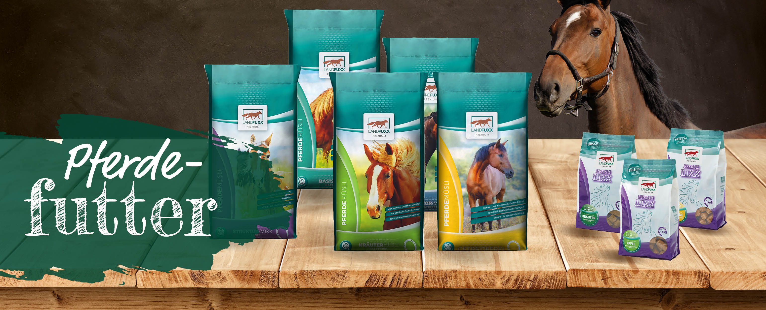 - Beim LANDFUXX PREMIUM Pferdefutter bieten wir eine vielfältige Auswahl an erstklassigem Pferdefutter die die individuellen Bedürfnisse jedes Pferdes zu erfüllen. Wir bieten verschiedene Müslis, ein Kräuter-Mash und Pellets an.